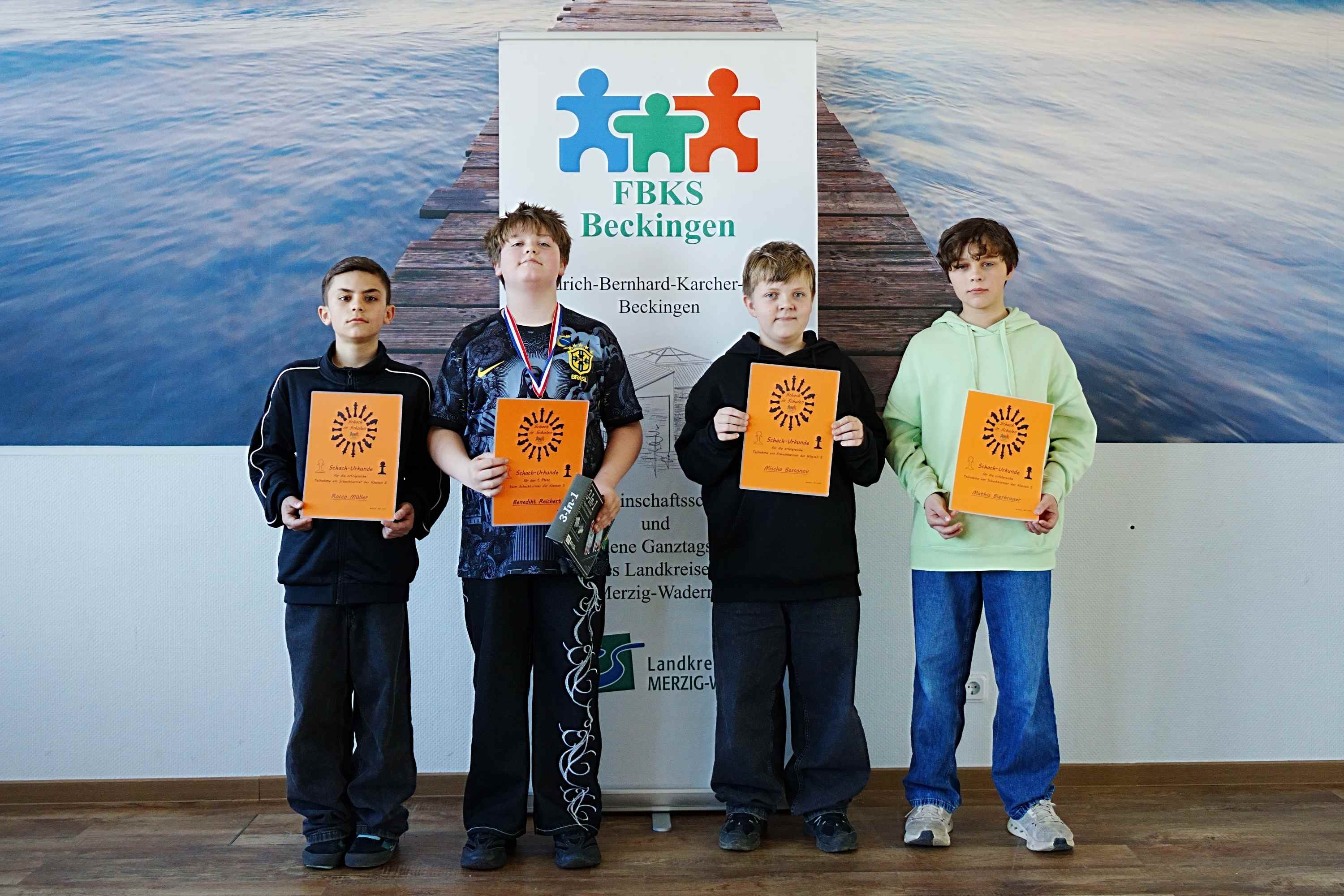 Das Turnier und den Sonderpreis – ein Schachspiel sowie eine Medaille – gewann Benedikt Reichert aus der 5a, den zweiten Platz erreichte knapp dahinter Mischa Bessonov. Aber auch Mathis und Rocco schlugen sich tapfer und wurden mit einer Urkunde geehrt.